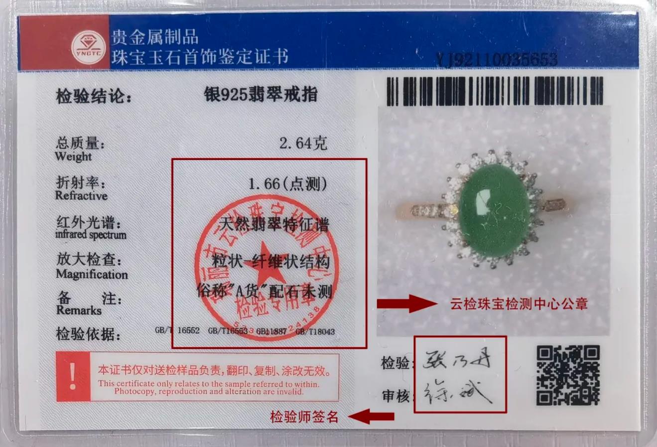 证书内容并不是固定的,可以选择不同的项目,只要项目中包含有能够满足保证样品唯一性的项目,如编号、外观描述、照片和质量,以及证明性的项目,如放大检查、红外光谱等即可。